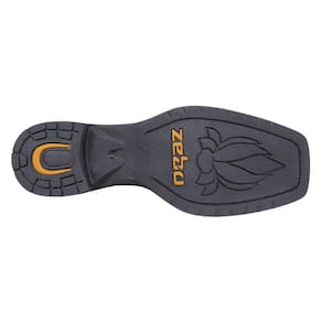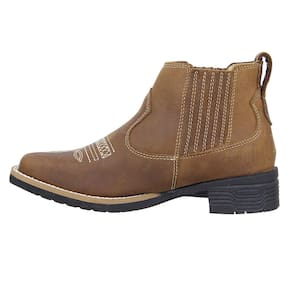 Botina feminina Zebu fabricada em couro na cor Marrom, possui cano curto com elásticos laterais, bico quadrado com florão costurado no peito do pé, vira costurada e solado de borracha.