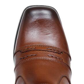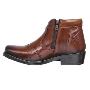 Botina masculina Zebu fabricada em couro na cor Whisky, possui cano curto com zíperes laterais, bico quadrado, costuras reforçadas e solado de borracha.
