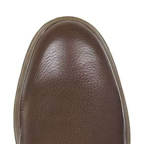 Uma Botina modelo Masculino da marca Zebu, esta fabricada em couro na cor Pinhão, possui cano curto com elásticos laterais, bico redondo, vira colada e solado de borracha detalhado.