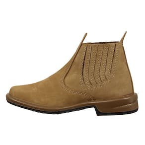 Uma Botina masculina da marca Bretão, esta fabricada em couro na cor Caramelo, possui cano curto com elásticos laterais, bico redondo e solado de borracha.