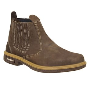 Uma Botina Masculina da marca Bretão, esta fabricada em couro na cor Marrom, possui cano curto com elásticos laterais, bico quadrado e solado de borracha colado.