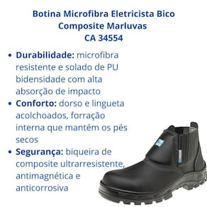 Botina Microfibra Eletricista Bico Composite Marluvas CA 34554 Botina de segurança confeccionada em microfibra na cor preta, com proteção elétrica e mecânica. Ideal para profissionais que atuam em áreas como construção civil, mecânica e manutenção industrial, oferece proteção contra choques em instalações elétricas de baixa tensão. Sem componentes metálicos, atende à NR 10. Possui fechamento em elástico, dorso acolchoado, abas laterais para calce, forração interna com tratamento antibacteriano, biqueira de composite leve e ultrarresistente, solado isolante em PU bidensidade, injetado diretamente no cabedal, e palmilha de montagem em poliéster resinado.