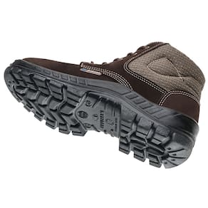 Solado: Constituído de duas camadas de poliuretano (PU), injetado diretamente no cabedal, sendo a 1ª camada (entressola) mais macia e leve, com densidade de 0,4g/cm³ proporcionando maior conforto; e 2ª camada (sola) mais compacta com densidade de 1,0 g/cm³, resistente a abrasão com sistema antiderrapante constituído de ranhuras especiais de 3mm de altura e 6mm de largura e resistencia ao escorregamento em piso cerâmico e piso de aço (Nível SRC).