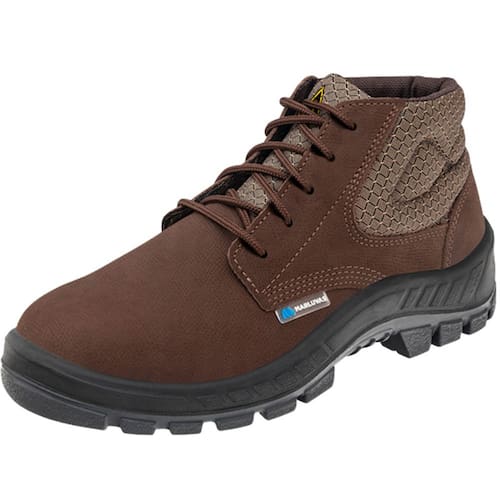 Especificações técnicas -Material: couro nobuck hidrofugado na cor café -Fechamento: cadarço com passadores sem metais -Forração interna: Air Comfort com tecnologia antibacteriana -Palmilha: montagem em poliéster resinado resistente à perfuração -Solado: PU bidensidade injetado no cabedal com sistema de absorção de impacto -Biqueira: polipropileno