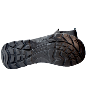 Solado: Constituído de duas camadas de poliuretano (PU), injetado diretamente no cabedal, sendo a 1ª camada (entressola) mais macia e leve, com densidade de 0,4g/cm³ proporcionando maior conforto; e 2ª camada (sola) mais compacta com densidade de 0,9 g/cm³, resistente a abrasão com sistema antiderrapante constituído de ranhuras especiais de 3mm de altura e 6mm de largura.Bico: PVC