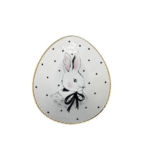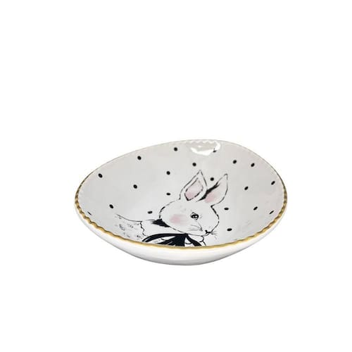 Bowl com pintura de coelho, bolinhas e borda com ouro, peça pintada a mão.
