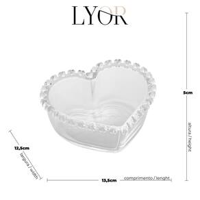 Características: - Material de Alta Qualidade: Feito em cristal, proporciona um brilho especial e uma aparência sofisticada. - Design em Formato de Coração: Uma forma encantadora que se destaca em qualquer ambiente, ideal para presentear ou decorar. - Dimensões Compactas: Medindo 13,5 x 12,5 x 5 cm, é perfeito para servir petiscos, doces ou como peça decorativa. - Cor Transparente: A transparência do cristal combina com qualquer estilo de decoração, oferecendo versatilidade.