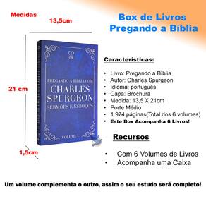 L1178. Medidas: 13,5 x 21 x 10,7cm. Box de Livros Espirituais Cristãos 1 Pregando a Bíblia com Charles Spurgeon, Sermões e Esboços, 6 Volumes. Capa Brochura. (Charles Spurgeon). CARACTERÍSTICAS: Autor: Charles Spurgeon Capa: Brochura Idioma: português Tamanho: 13,5 x 21cm Porte: Médio Páginas: 1.974 páginas (total de páginas com todos os volumes) Este Box Acompanha 6 Livros! SOBRE O LIVRO: O Box Pregando a Bíblia com Spurgeon contém 6 livros, inédito no Brasil, com fitilho, + de 1900 páginas, 78 sermões integrais de Spurgeon com esboços completos para você. Ao ler um esboço de Spurgeon na íntegra, você encontrará inspirações para auxiliá-lo a pregar a Palavra de Deus, nas veredas do Príncipe dos Pregadores! O Box aborda os seguintes temas: Conforto divino Paz de Deus Salvação Glória de Cristo Graça de Deus Provações pelas quais os cristãos passam Proteção do Senhor Arrependimento e redenção Bênçãos de Deus para a vida terrena Crescimento espiritual Oração fervorosa Alegria da salvação Amor de Cristo Crescimento espiritual