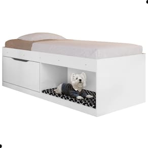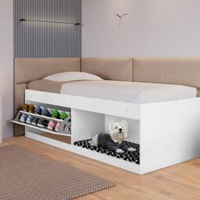 A Cama Box de Solteiro oferece conforto e funcionalidade, com 4 prateleiras e 1 sapateira para 8 pares de sapatos. Acompanha colchão e kit pet.