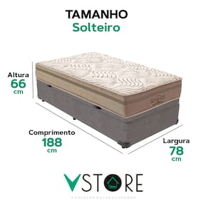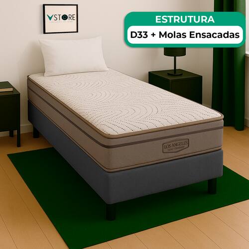 A tecnologia que a sua casa merece está na V-Store! O Conjunto Colchão Los Angeles + Base Box Baú Bravus da V-Store oferece conforto e funcionalidade. O colchão, com molas ensacadas e sistema EPS, garante suporte ideal, conforto térmico e proteção antiácaro. A base box, com amplo espaço de armazenamento, é feita de madeira reflorestada e revestida com tecido resistente, proporcionando praticidade e sofisticação ao seu quarto.Característica Do Colchão: Modelo: Los AngelesMarca: V-StoreTamanho: SolteiroDimensões: 78x28x188 (Largura x Altura x Comprimento)Conforto: MédioSistema: Molas EnsacadasPillow: Não se aplicaPeso Máximo recomendado: 150 kg (Por pessoa)Proteções: Antiácaro, antialérgico, antifungo, antimofoGarantia: 12 Meses (Espuma) / 10 anos ( Conjunto de Molas Ensacadas)Característica Da Base: Marca: V-StoreModelo: BravusCor do Box: CinzaTamanho: SolteiroDimensões: 78x44x188 (Largura x Altura x Comprimento)Estrutura: MadeiraPeso máximo recomendado: 150 kg (Por Pessoa)Altura do Box: 38 cmAltura dos Pés: 6 cmAltura total: 44 cmGarantia: 12 Meses (Estrutura) / 3 meses (Tecido)Selo Ecologicamente CorretoAtenção:- Antes de finalizar sua compra, recomendamos que verifique se as dimensões do produto são adequadas para serem transportadas pelos elevadores, portas, escadas e corredores de sua residência. Ressaltamos que não nos responsabilizamos pelo transporte do produto por meios específicos, como escadas, guinchos ou içamentos.- É possível que hajam leves variações de cor de acordo com o dispositivo que está sendo utilizado como smartphones, computadores, monitores e outros.