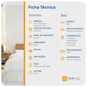 Colchão: Espuma D20, Poliéster; Base Box Baú: Madeira tratada, Material SintéticoVendido e entregue por Lucas Colchões