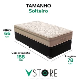 A tecnologia que a sua casa merece está na V-Store! O Conjunto Colchão Los Angeles + Base Box Baú Bravus da V-Store oferece conforto e funcionalidade. O colchão, com molas ensacadas e sistema EPS, garante suporte ideal, conforto térmico e proteção antiácaro. A base box, com amplo espaço de armazenamento, é feita de madeira reflorestada e revestida com tecido resistente, proporcionando praticidade e sofisticação ao seu quarto.Característica Do Colchão: Modelo: Los AngelesMarca: V-StoreTamanho: SolteiroDimensões: 78x28x188 (Largura x Altura x Comprimento)Conforto: MédioSistema: Molas EnsacadasPillow: Não se aplicaPeso Máximo recomendado: 150 kg (Por pessoa)Proteções: Antiácaro, antialérgico, antifungo, antimofoGarantia: 12 Meses (Espuma) / 10 anos ( Conjunto de Molas Ensacadas)Característica Da Base: Marca: V-StoreModelo: BravusCor do Box: PretoTamanho: SolteiroDimensões: 78x44x188 (Largura x Altura x Comprimento)Estrutura: MadeiraPeso máximo recomendado: 150 kg (Por Pessoa)Altura do Box: 38 cmAltura dos Pés: 6 cmAltura total: 44 cmGarantia: 12 Meses (Estrutura) / 3 meses (Tecido)Selo Ecologicamente CorretoAtenção:- Antes de finalizar sua compra, recomendamos que verifique se as dimensões do produto são adequadas para serem transportadas pelos elevadores, portas, escadas e corredores de sua residência. Ressaltamos que não nos responsabilizamos pelo transporte do produto por meios específicos, como escadas, guinchos ou içamentos.- É possível que hajam leves variações de cor de acordo com o dispositivo que está sendo utilizado como smartphones, computadores, monitores e outros.