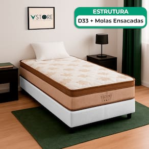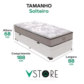 A tecnologia que a sua casa merece está na V-Store! O Conjunto Colchão Four Seasons e Base Box Baú Bravus é a solução ideal para quem busca conforto, durabilidade e praticidade. O colchão, com molas ensacadas, pillow top e tecnologia EPS, oferece suporte independente e conforto térmico, enquanto o revestimento em malha 100% algodão e tratamentos antiácaro e antialérgico garantem mais saúde e bem-estar. A Base Box Baú Bravus, feita com madeira reflorestada e revestida com tecido sintético, combina resistência, elegância e funcionalidade, oferecendo um excelente espaço de armazenamento e otimizando o seu quarto.Característica Do Colchão: Modelo: Four SeasonMarca: V-StoreTamanho: SolteiroDimensões: 88x30x188 (Largura x Altura x Comprimento)Conforto: MédioSistema: Molas EnsacadasPillow: Pillow TopPeso Máximo recomendado: 150 kg (Por pessoa)Proteções: Antiácaro, antialérgico, antifungo, antimofoGarantia: 12 Meses (Espuma) / 10 anos ( Conjunto de Molas Ensacadas)Característica Da Base: Marca: V-StoreModelo: BravusCor do Box: BrancoTamanho: SolteiroDimensões: 88x44x188 (Largura x Altura x Comprimento)Estrutura: MadeiraPeso máximo recomendado: 150 kg (Por Pessoa)Altura do Box: 38 cmAltura dos Pés: 6 cmAltura total: 44 cmGarantia: 12 Meses (Estrutura) / 3 meses (Tecido)Selo Ecologicamente CorretoAtenção:- Antes de finalizar sua compra, recomendamos que verifique se as dimensões do produto são adequadas para serem transportadas pelos elevadores, portas, escadas e corredores de sua residência. Ressaltamos que não nos responsabilizamos pelo transporte do produto por meios específicos, como escadas, guinchos ou içamentos.- É possível que hajam leves variações de cor de acordo com o dispositivo que está sendo utilizado como smartphones, computadores, monitores e outros.