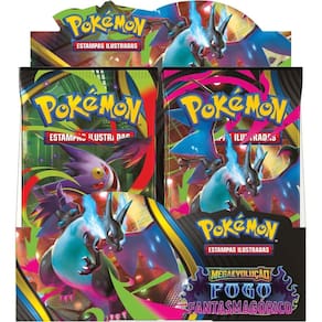Box Display de pacotes de booster de Megaevolução - Fogo Fantasmagorico do Pokémon Estampas Ilustradas. Contém 36 (trinta e seis) pacotes de booster incríveis contendo 6 (seis) unidades de carta no formato 63mm x 88mm em cada pacote, totalizando 216 cartas.