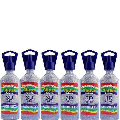 Box Kit 6 Dimensional Glitter 3D Acrilex 35ml - Escolha Cor Cor: Glitter Relevo 3D 202 Prata Kit C/6 Dimensional Glitter Relevo 3D 201 Ouro Acrilex 35ml