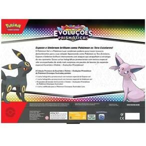 O Sol e a Lua colidem em um espetáculo de poder e mistério com a chegada de Espeon ex e Umbreon ex como Pokémon Tera Estelares!Esses Pokémon Evoluídos combinam forças para iluminar sua coleção com cartas promocionais holográficas exclusivas e texturizadas que se destacam tanto visualmente quanto em estratégia.Cada carta apresenta habilidades únicas capazes de atrapalhar as táticas do seu oponente, tornando esses Pokémon não apenas incríveis de se colecionar, mas também poderosos no campo de batalha.Vantagens* Cartas promocionais holográficas exclusivas de Espeon ex e Umbreon ex.* Textura especial e acabamento brilhante nas cartas.* Pacotes de booster da expansão especial Escarlate e Violeta Evoluções Prismáticas.EspecificaçõesConteúdo da embalagem: 1 Carta holográfica promocional com textura especial de Espeon ex, 1 Carta holográfica promocional com textura especial de Umbreon ex, 10 Pacotes de booster de Escarlate e Violeta Evoluções Prismáticas do Pokémon Estampas Ilustradas e 1 Carta codificada para o Pokémon Estampas Ilustradas Live.Código de barras: 7896192352590Referência: 35260Idade recomendada: A partir de 4 anos de idade.Aviso importante: As cores podem variar entre as imagens e produto. Imagens meramente ilustrativas.