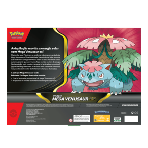 Aniquilação movida a energia solar com Mega Venusaur ex! Mantenha seus Pokémon na potência máxima com a ajuda de Mega Venusaur ex! Sua Habilidade Transferência Solar permite que você mova Energia de Planta entre os seus Pokémon como quiser e garante que você nunca fique na mão na hora do ataque. Nesta coleção, você receberá uma carta laminada promocional jogável de Mega Venusaur ex e ainda mais cartas de Pokémon nos pacotes de booster do Pokémon Estampas Ilustradas. A Coleção Mega Venusaur ex do Pokémon Estampas Ilustradas contém: • 1 carta laminada promocional de Mega Venusaur ex! • 10 pacotes de booster do Pokémon Estampas Ilustradas!
