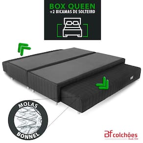 O Box Bicama Dupla da BF Colchões possui duas camas de solteiro extras para você receber aquela visita inusitada ou simplesmente acomodar toda a sua família. Prático e sofisticado, tem a função básica de box para o seu colchão queen e outras duas peças, que puxadas nas laterais, poderão ser usadas diretamente como camas extras e macias. As bicamas não necessitam de colchões pois já possuem a maciez e conforto das molas bonnel. Essa característica é uma novidade nesse mercado e é feita com a melhor matéria-prima: base de madeira, pés cromados, rodinhas rosqueáveis, tecido de microfibra e molas bonnel.