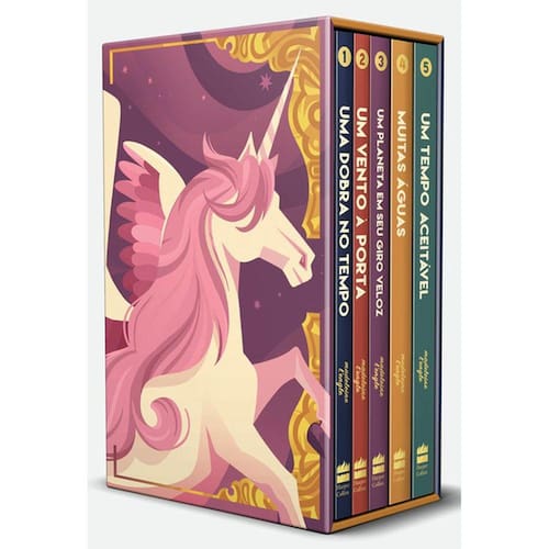 A série completa do clássico infantojuvenil agora em um box exclusivo! Em uma noite escura e tempestuosa, a jovem Meg Murry e seu irmão mais novo, Charles Wallace, descem para fazer um lanche quando recebem a visita de uma figura muito diferente. Essa inesperada criatura, porém, irá levá-los em uma perigosa e extraordinária jornada para salvar o pai dos dois e o destino do universo. Assim se inicia uma saga que percorreu gerações e se tornou um clássico da fantasia e da ficção científica. Composta por cinco livros — Uma dobra no tempo; Um vento à porta; Um planeta em seu giro veloz; Muitas águas e Um tempo aceitável —, a obra de Madeleine L’Engle figura em praticamente todas as listas de melhores livros juvenis. E, pela primeira vez no Brasil, ganha um box completo com ilustrações de capa por Isadora Zeferino. Envolvendo temas como a quinta dimensão, viagem no tempo e DNA mitocondrial, e os unindo com elementos fantásticos, alienígenas e aventuras de tirar o fôlego, a série Uma dobra no tempo é uma leitura fascinante para todas as idades.