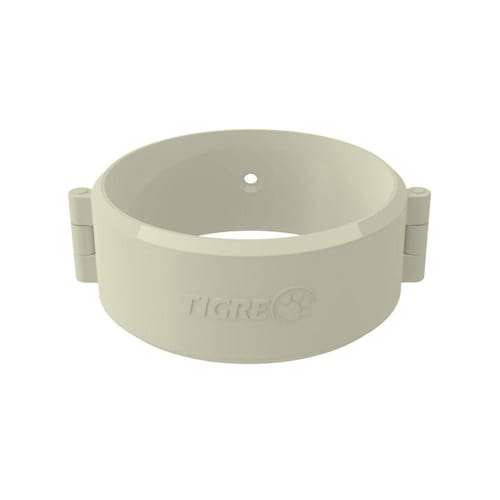 Recomenda-se utilizar suas braçadeiras a cada 3m de condutor circular. Caso seja necessário, utilize prumo para manter o condutor na vertical durante a instalação. A braçadeira para condutor circular é composta por um anel articulado e um pino de travamento. Primeiro fixe a braçadeira na parede com parafuso e bucha. Então, monte o condutor e trave a abraçadeira com o pino.