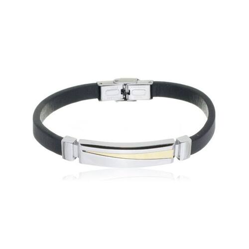 Bracelete aço 20cm couro preto trabalhado com placa 10x36mm steel detalhe diagonal gold