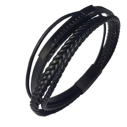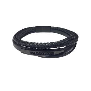 Bracelete Rosso 21Cm Couro Preto Fio Liso Trancado E Grosso