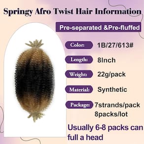 “ Sunsmilely Marley Twist Braiding Hair, cabelo afro Twist de 8 polegadas e 12 polegadas, 8 pacotes de cabelo enrolados para cabelos macios. Vantagens: Pré-afofado e pré-separado, muito macio, leve, sem cheiro, agradável à pele, com aparência natural, perfeito para qualquer penteado protetor. Informações: cabelo com torção afro elástica de 8 polegadas, 22 g/pacote, cabelo afro primavera de 12 polegadas, 30 g/pacote, 7 fios/pacote, 8 pacotes/lote. Normalmente, 6-8 pacotes podem encher uma cabeça. Vem com uma agulha de crochê e algumas miçangas. Cores disponíveis: 1B, 2#, 4#, 30#, 350#, T30, Tgray, 1B/30/27, 1B/27/613. Material: cabelo pré-afofado com torção de primavera, feito com fibra sintética retardante de chamas de baixa temperatura de alta qualidade, 100% feito à mão. Fácil de instalar: o cabelo elástico afro torcido é pré-afofado e pré-separado, fácil de instalar e pode ser trançado para vários penteados, conforme você quiser. Pode ser utilizado para fazer cabelos torcidos de primavera, cabelos com torção de paixão, cabelos envelhecidos com mechas de borboleta, enrolar cabelos para cabelos macios, tranças gigantes e quaisquer outros cabelos macios. Ocasiões: um toque excêntrico pré-fofo, adequado para uso diário, casamentos, festas, apresentações, viagens, dramatizações e sempre que você quiser mostrar seu charme. “ -?Material de cabelo Kinky Braiding?: cabelo trançado Marley Twist Sunsmilely de 8 polegadas feito de fibra sintética de baixa temperatura de alta qualidade, muito macio, com aparência natural, perfeito para qualquer penteado protetor. -?Informações sobre o cabelo trançado Marley Twist?: cabelo trançado crespo de 8 polegadas, 22 g/pacote, 7 fios/pacote, 8 pacotes/lote. Normalmente, 6-8 pacotes podem encher uma cabeça. Vem com uma agulha de crochê e algumas miçangas. Cores disponíveis: 1B, 2#, 4#, 30#, 350#, T30, Tgray, 1B/30/27, 1B/27/613. -?Springy Afro Twist Hair, fácil de instalar?: O cabelo trançado Kinky Twist é pré-afofado e pré-separado, fácil de instalar e pode ser trançado para vários penteados, conforme você quiser. Pode ser utilizado para fazer cabelos torcidos de primavera, cabelos com torção de paixão, cabelos envelhecidos com mechas de borboleta, enrolar cabelos para cabelos macios, tranças gigantes e quaisquer outros cabelos macios. -?Vantagens da trança Twist Hair?: O cabelo elástico afro torcido é pré-afofado e pré-separado, leve, inodoro, não agride a pele, é fácil de instalar e dura muito tempo. -?Kinky Twist Braiding Hair Occasions?: trança Twist Hair adequada para uso diário, casamentos, festas, apresentações, viagens, RPG e sempre que você quiser mostrar seu charme.