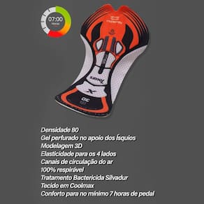 - Forro masculino importado CoolMax D-80 + Gel, 3D com detalhes perfurados para arejar, feito para no mínimo de 7 horas de pedal, além de tratamento bactericida;