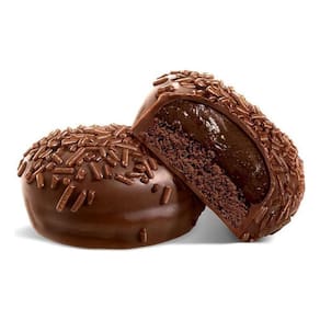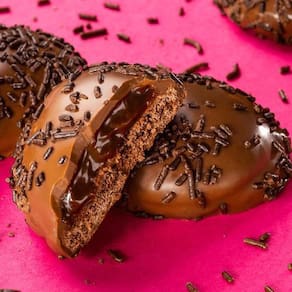 Base de cookie sabor chocolate com gotas sabor chocolate Recheio cremoso sabor brigadeiro Cobertura generosa de chocolate ao leite E para finalizar, decoração com granulado crocante sabor chocolate