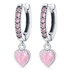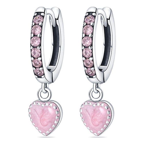 "Brilho, delicadeza e amor em cada detalhe. Brinco de prata 925 argola com zircônias e pingente de coração rosa: o símbolo perfeito para iluminar seus momentos mais especiais."