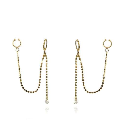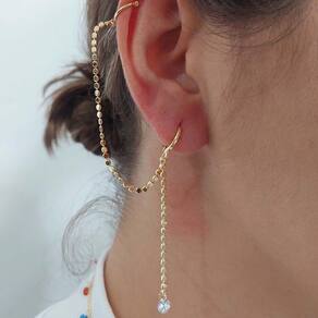 Esse brinco é composto por uma argolinha articulada e duas correntes, uma delas temos um ponto de luz e no outro um piercing fake.