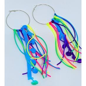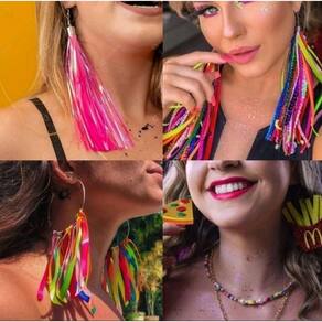 Brinco Carnaval Bloquinho Par de Brincos Argola Aço Girassol Fitinhas Franjas Pompom Neon Festas Fios Lantejoula 2025 - Cor: Argola Fitinha