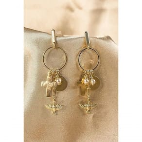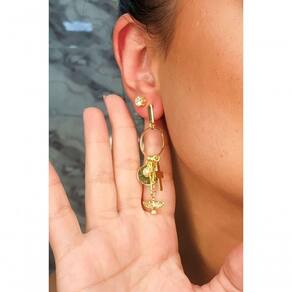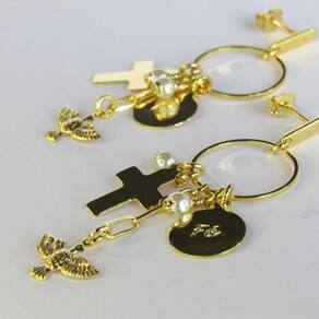 Este brinco apresenta encantadores pingentes religiosos, banhados em ouro 18k, oferecendo um visual espiritual e elegante. Os pingentes adicionam um toque de fé e devoção à peça, tornando-a ideal para quem busca uma joia única e cheia de significado. Perfeito para complementar looks sofisticados com um toque de espiritualidade e estilo.
