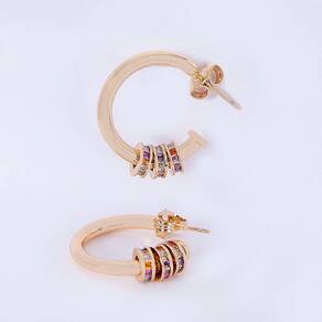 Um par de brincos com pingentes banhados a ouro e zircônias coloridas. É delicado e luxuoso que te deixa em destaque em qualquer situação.