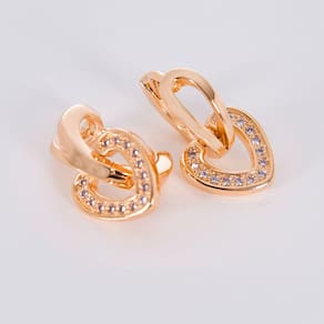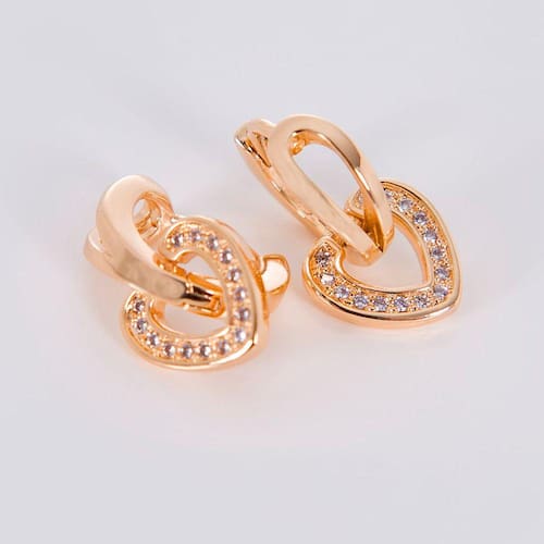 Um par de brincos com coração banhado a ouro e aplicação de microzircônias brancas . É delicado e luxuoso que te deixa em destaque em qualquer situação.