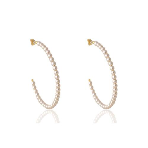Brinco de argola com pérolas pequenas folheado em ouro 18k Um brinco de argola lindo de tamanho grande com pérola toda folheada em ouro 18k. Para quem já ama argolas, vai se encantar com as combinações que são possíveis fazer com esse acessório lindo. Perfeito para você usar no seu dia a dia. Use e abuse da sua criatividade e mostre sua essência através da moda de acessórios. Você vai se encantar. Esse acessório é antialérgico diâmetro: 5,8cm.Garantia: 6 meses. Ficha técnica - Cor: Dourado Ean: 7898707881144