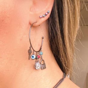 Brinco de argola com pingentes de chave, cadeado, medalinha, ponto de luz e olho grego ródio negro