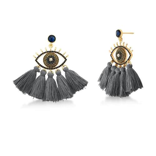 Brinco Bijuteria Pêndulo Tassel Olho com Strass Azul e Fumê, cinco Franjas em tecido na Cor Cinza. Dá um charme para o visual, Ideal para todos Momentos especiais. Arrase