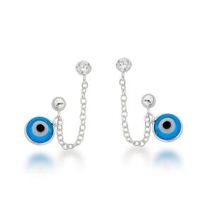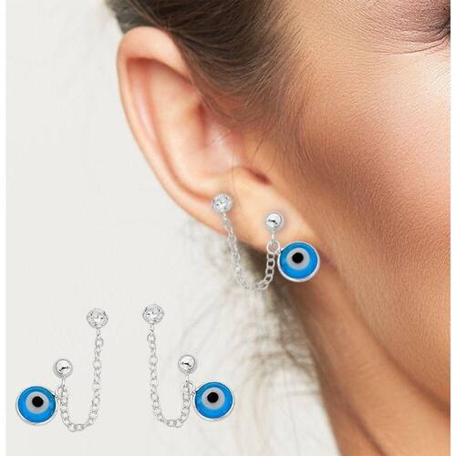 Brinco Duplo com Olho Grego, ponto de Luz e Corrente Prata 925