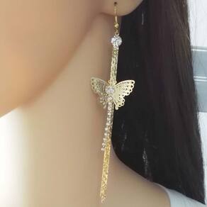 O destaque fica por conta da borboleta em metal vazado, que traz feminilidade e leveza à peça. A franja longa com strass adiciona brilho e movimento, tornando-o perfeito para festas, eventos, casamentos, formaturas ou para compor looks noturnos com glamour.