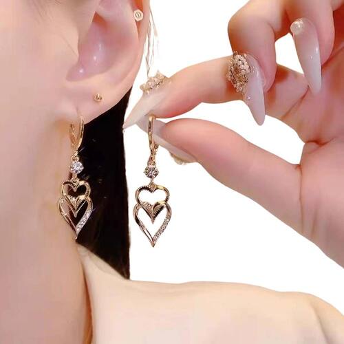 Brinco Feminino Duplo Coração Strass Luxo Festas Brilho