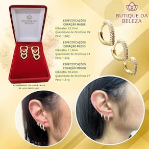 Brinco feminino folheado ouro trio coração cravejado pedras zircônia em caixa de luxo