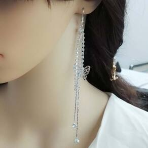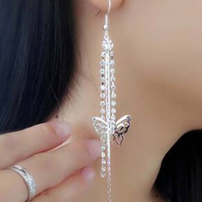 Brinco Feminino Franja Longo Strass Prata Borboletas Brilho