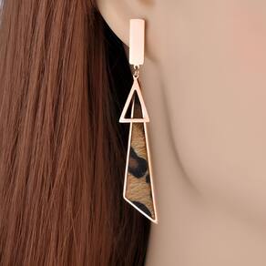 Esses brincos combinam um design geométrico sofisticado com um toque exótico, graças à estampa animal. Eles possuem uma base retangular em rosé, que se conecta a um pingente triangular alongado. O contorno em rosé cria uma moldura elegante para o interior revestido com estampa animal em tons de marrom, preto e bege, lembrando uma pele com padrão de onça ou leopardo.