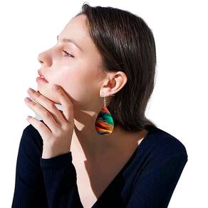 A combinação de cores vibrantes e o material em couro conferem ao brinco uma aparência única e cheia de vida. Além disso, o formato de gota pendurada traz um toque de ousadia e originalidade, tornando-o ideal para mulheres que buscam se destacar com acessórios diferenciados.