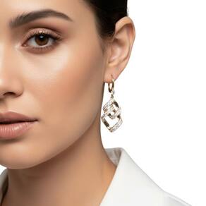 Inove no seu visual com este brinco feminino que une geometria moderna e sofisticação. A peça apresenta um design exclusivo de dois losangos vazados e entrelaçados, criando um efeito visual de profundidade e movimento. Toda a estrutura frontal é meticulosamente cravejada com microzircônias, garantindo um brilho contínuo que ilumina o rosto com elegância.
