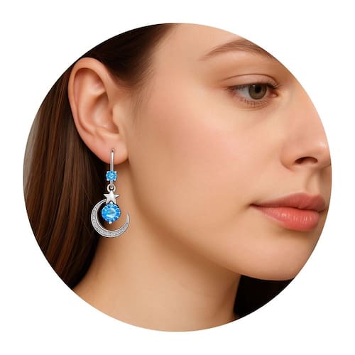 Encante-se com a delicadeza deste brinco celestial! Com design inspirado no céu noturno, ele traz uma estrela em destaque sobre uma lua crescente cravejada de strass e acompanhada por uma pedra brilhante. Um acessório leve, elegante e cheio de brilho!