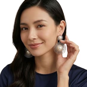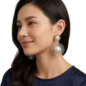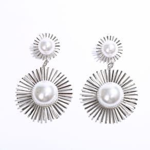 Brinco feminino com design elegante inspirado no formato de sol, composto por pérolas centrais e detalhes metálicos que formam um efeito radiante. O modelo possui duas partes que criam movimento e destacam o visual.