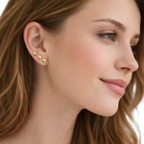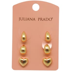 Conjunto de brincos Juliana Prado com design minimalista e acabamento polido em tom dourado intenso, que transmite elegância e sofisticação. O kit é composto por três pares com formatos distintos e atemporais: gota alongada, oval arredondado e coração delicado.