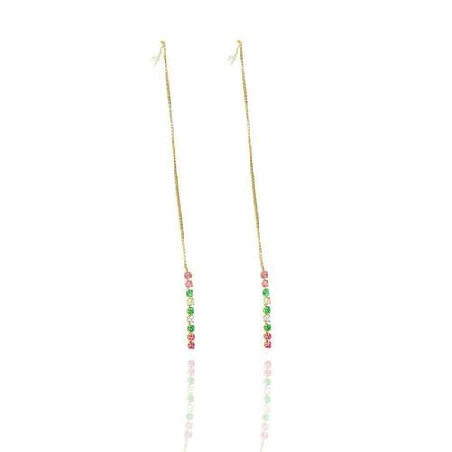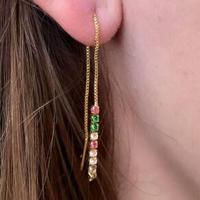 Este brinco apresenta um fio de corrente com zircônias coloridas , banhado em ouro 18k. O design vibrante e cheio de cor adiciona um toque de alegria e estilo ao seu visual. Ideal para quem busca uma peça única e chamativa, perfeita para complementar looks tanto casuais quanto formais. As zircônias coloridas são cuidadosamente cravadas para garantir brilho e durabilidade.